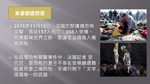 該事件在法國巴黎發生(2015)至今,已屆滿一年多。一年以來,引發許多法國家長選擇帶著孩子一起面對真實的世界,一起上街到肇事地點,以鮮花來代替報復心理,以參與表達事件的感想來代替恐懼逃避。法國人在群體的哀傷中,體會這個巨大的傷害事件對生活跟人們的影響。