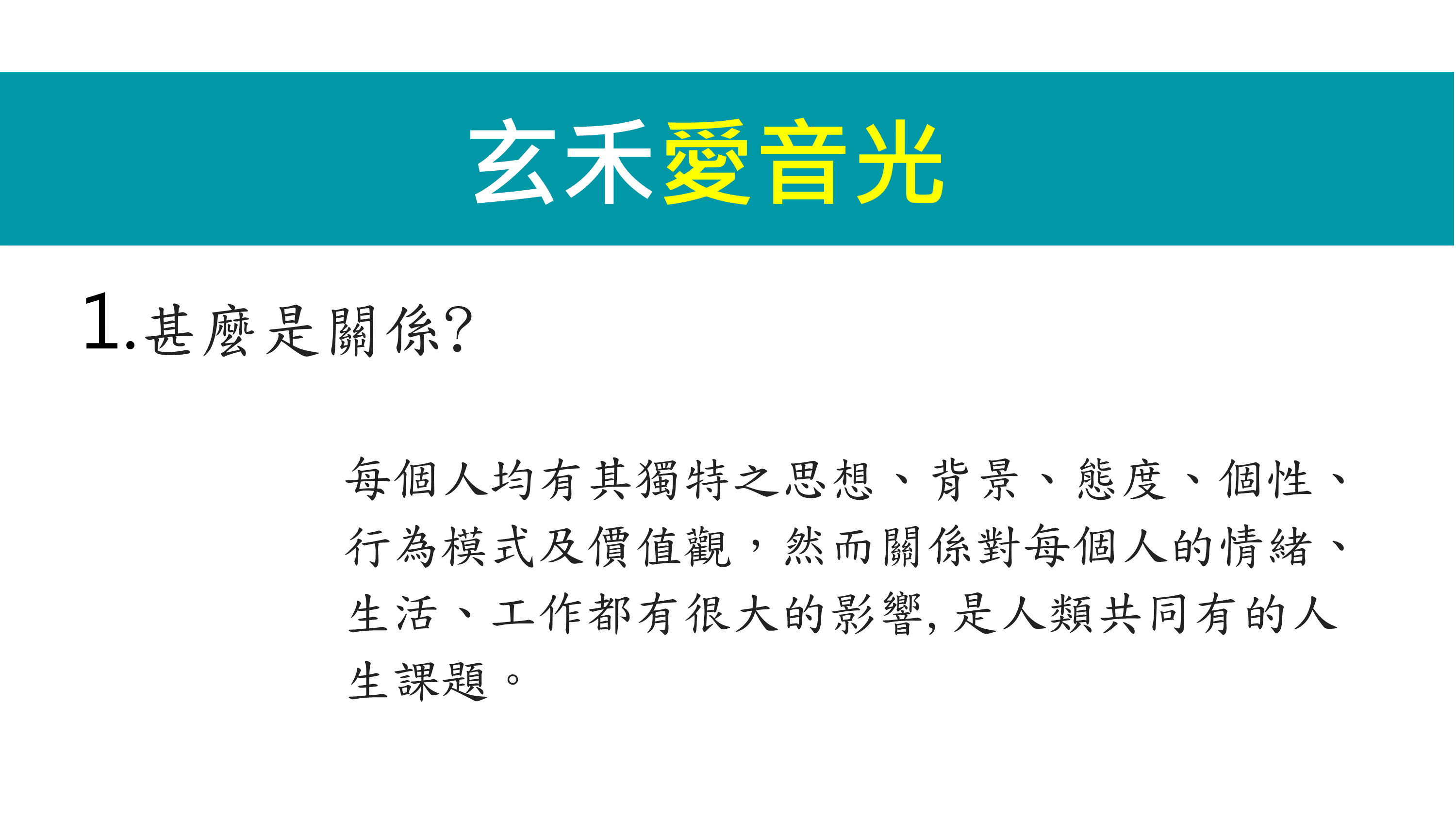 玄禾: 我想我跟所有的朋友一樣.在這個社會上,我們藉由許許多多人的幫助,我們才有辦法過著順利舒適的生活.我們生活在一個群聚的社會裡面,人與人之間關係的品質,其實很大程度決定我們生活經驗的水準. 與各種關係擁有一種良好的互動,就顯得非常的重要.一但與他人關係卡住了,我們在人生的旅途上就會感到孤單, 快樂的時刻沒有人可以陪你一起分享,艱難的時刻也沒有人陪伴渡過人生的低潮. 舉例說如果我們在工作中如果關係不好,就會覺得孤立無援,而且你無法成就更大的事情.所以我們需要集結許多人不同的智慧與專長,才有辦法在各個領域創造出美好的成果.可是當我們想改善關係時,我們或許會 跟別人說好話,做出友好的行為.
