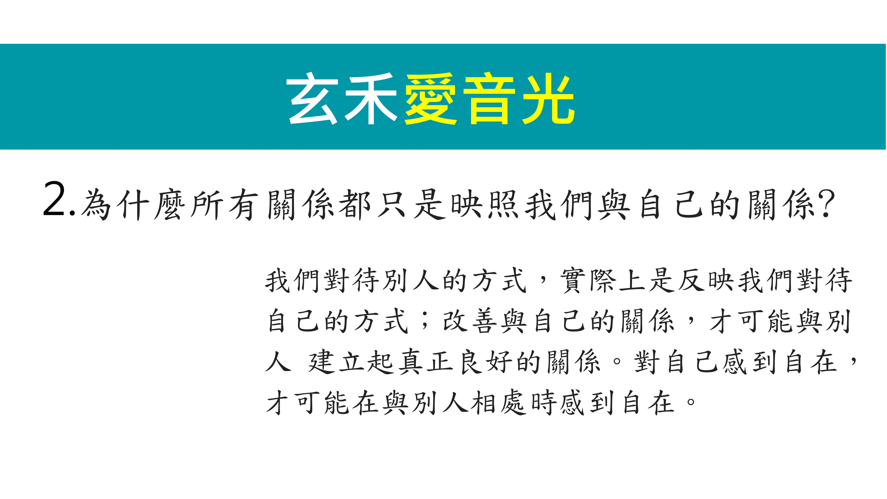玄禾:我跟大家在簡單的分析一下.因為這一個結論是出於,我自己從小到大在關係裏面的磨練之後所發現.那為什麼所有的關係都沒有問題呢?我們這麼想想,如果說我們是一個獨立能夠好好愛自己的一個個體,那我們對所有的關係裡面就沒有所謂的要求.我就不會期待說這個人應該要對我好一點,應該要主動一點,應該事事項項都為我想到.如果我們對他人在關係中都沒有要求的話,那這就是一段獨立又健康的關係.
