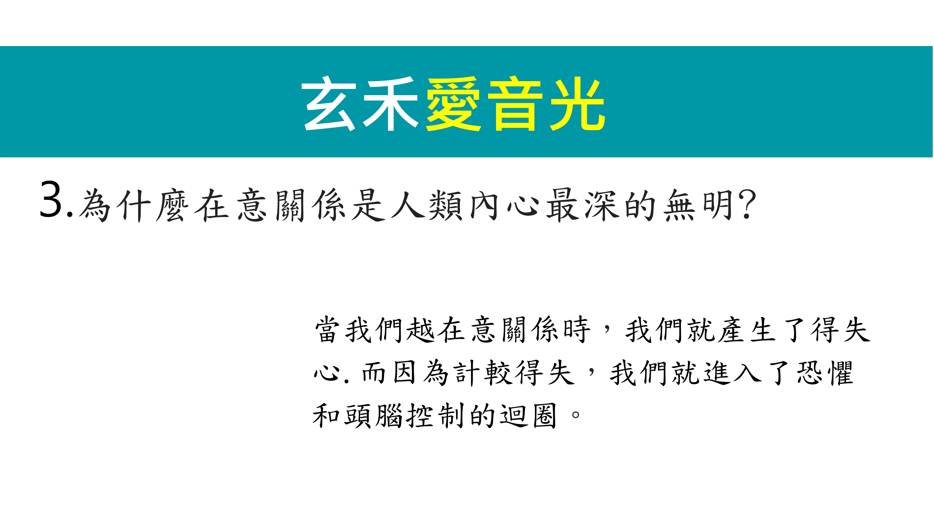 玄禾:我覺得生命中所發生的所有事情,都是我們看待事情角度的一個轉變.所以如果我們覺得我們在意一個關係的時候,我是建議說,就我自己成長的經驗來說,往往我在關係裏頭受挫的時候,我並不清楚我在關係裏頭真正想要的是甚麼?後來我學習到,比如說我跟一個朋友關係好了.比如說我跟這位朋友在關係中有衝撞,我會試著讓自己冷靜下來,然後試著去想想,為什麼我這麼在意這位朋友.那背後的的原因到底是甚麼?