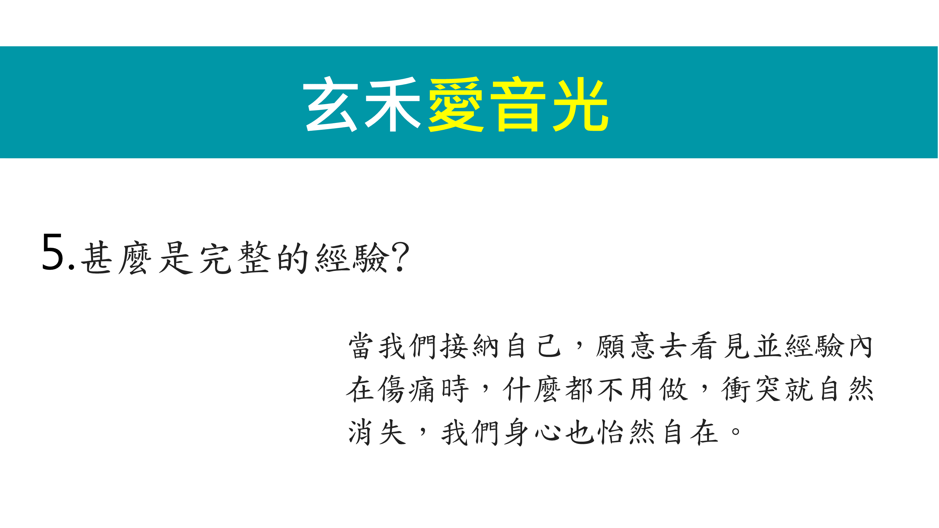"完整的經驗".有人說,我現在就正處於一段受苦的關係啦!比如說,我的老闆天天虐待我啊!我的先生天天打我啊!就算我有一個想要改變的意願,也無法改變這個現況啊!沒錯,所以我想跟大家分享我成長過來的經驗就是,外在的境遇並不會改變,可是我們可以改變我們看待他的角度.這句話怎麼說呢?假設我是處於一個受暴的婦女好了,我是處於這樣的一個狀況.一切先生的行為我沒辦法改變他,可是我可以真的完整的經驗.這就是我們說什麼叫做完整的經驗痛苦.痛苦,如果我們不完整的經驗,它就會不斷的被壓抑在我們身體的細胞裡面.因為恐懼只會越壓抑,累積越大.所以我們要如何去釋放我們身體裡面的恐懼呢?我們要如何的去釋放這一些負面的情緒呢?唯有不要害怕,不要逃避,而是要如實的面對.比如說我舉個列好了,我是一個被受暴的婦女.可是我以往我都希望有一天天神會突然改變我先生的腦袋,讓他不再打我.所以等於說,我自己是不接受這樣子的一個狀況的.可是我自己又感覺我自己事沒有能力去改變的,那我要從什麼樣的辦法想辦法來改變我的處境呢?那我的建議還有我成長所的出來的一個方法是:"我需要去完整的經驗這個痛苦".如果我先生繼續的打我,這次我會不逃避.我會很專注的去經驗這個體驗,而且我不寄望它會主動的改變.我們可以去想想,你看喔!你很痛苦,你很恐懼.可是如果你不坦然面對自己的狀況跟你的負面情緒的話,他只會被埋到更深更深更深.可是這一些東西都並不會從你的生命當中消失,可是他會在那個幽暗的角落不斷地影響你的人生.那什叫做完整的經驗呢?就是你不害怕,你不逃避,你做你自己.你去感受那份痛苦,跟那個痛苦在一起.當我們能夠接納自己的痛苦的時候,它就像一股在體內衝撞的能量.當我們願意陪伴這個受苦的自己,那個情緒說也奇怪的,它在我們體內衝撞著衝撞著,它就慢慢的慢慢的消失了.如果我們以科學的角度來看,這個叫做物質不滅定律.原先的負面情緒我們把它看作是一種能量,當這股能量我們願意接納他的時候,它就在我們的內在不斷的表達它自己.它的委屈它的不平,而這個聲音就在體內不斷的說著說著說著,它就轉化進入到我們中脈去了.