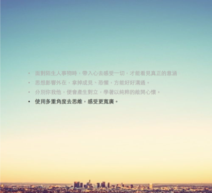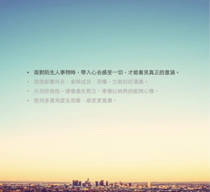 人往往對於陌生的人事物心生敵意,因而有分裂和戰爭,我們如何以愛出發呢?