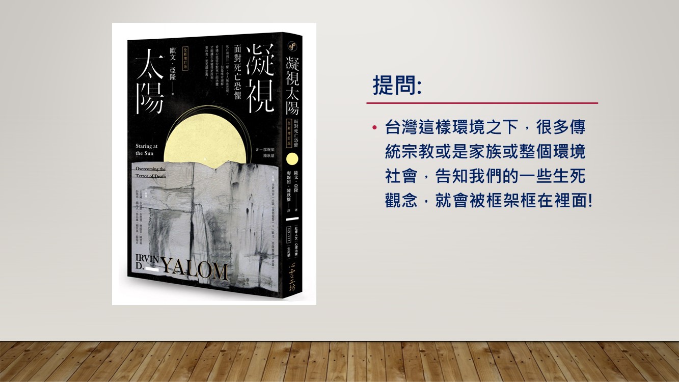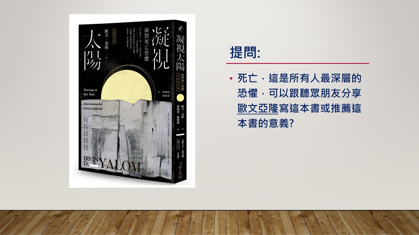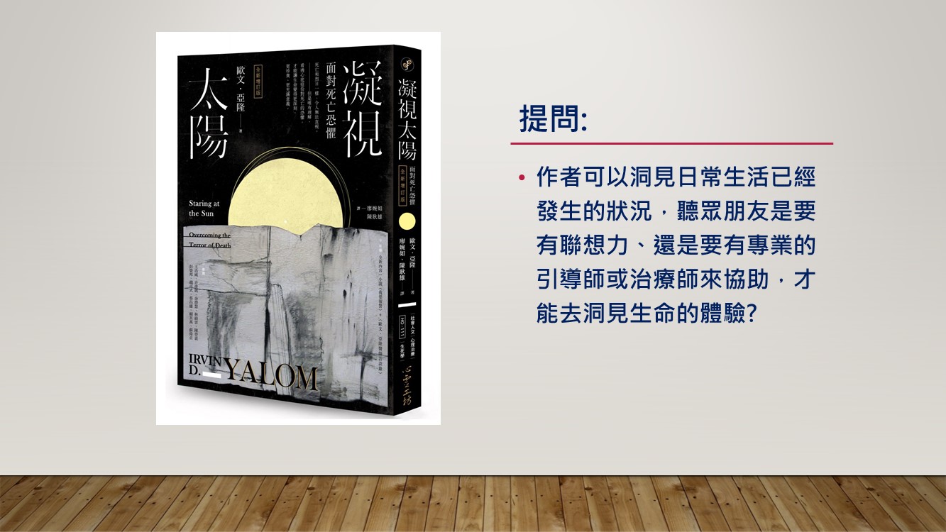 蔡:看這本書直接看跟自己生活經驗去對話就可以,去發現這方面的內涵書裡有一章是歐文亞隆把自己從小第一次接觸死亡,怎麼樣經歷的身邊親人的死亡,自己曾經經歷過一次接近死亡的車禍,後續對死亡焦慮反應及在治療再碰到案例上事情,非常生活化以個人傳記式的經驗方式呈現,沒有太多專業的門檻很庶民化的一本書。