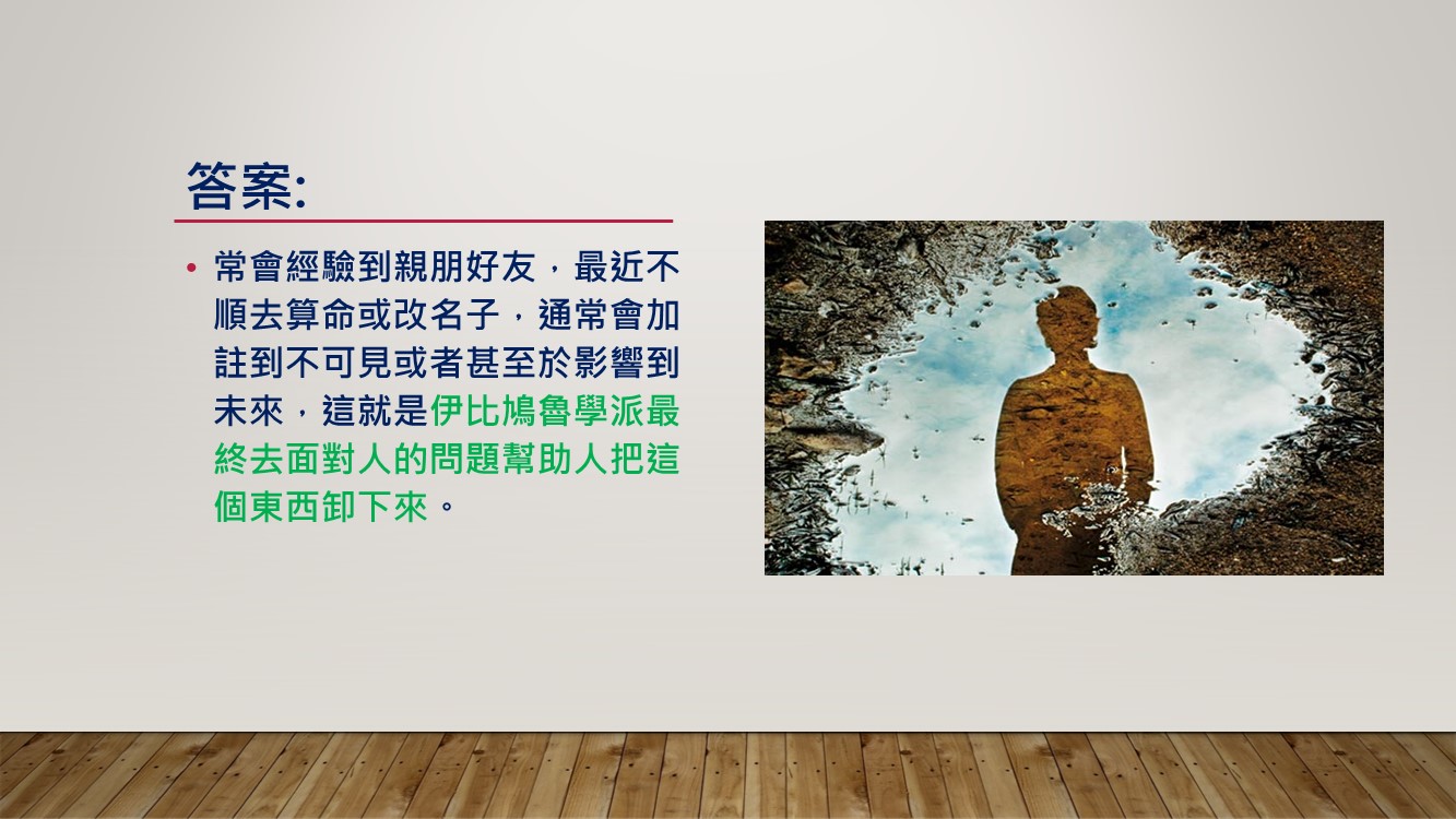 蔡:沒有錯,尤其是我們常會經驗到,親朋好友最近不是很順利就去給人家算命,還叫你改名子,通常都會加註到不可見或者甚至於會影響到未來的層面,但我們剛說的伊比鳩魯學派最終去學會面對人的問題,並幫助我們把這個東西卸下來。