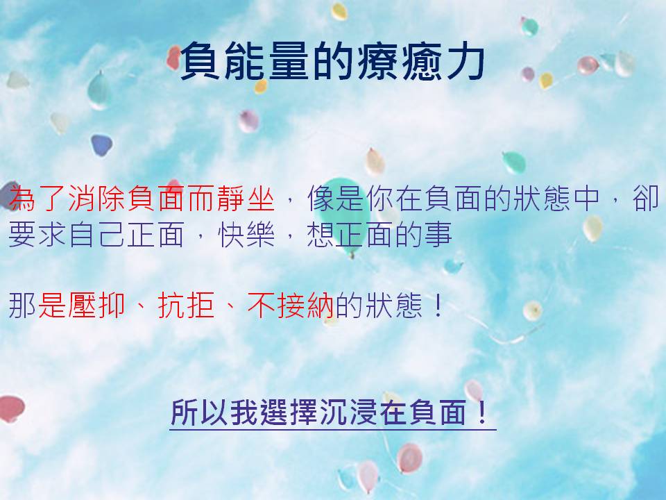 我知道我不能再抱著為了要平靜,消除這個負面而靜坐了,因為這就有點像是你在負面的狀態中,你卻要求自己要正面,要快樂,要想正面的事情,那是壓抑、抗拒、不接納的狀態!
