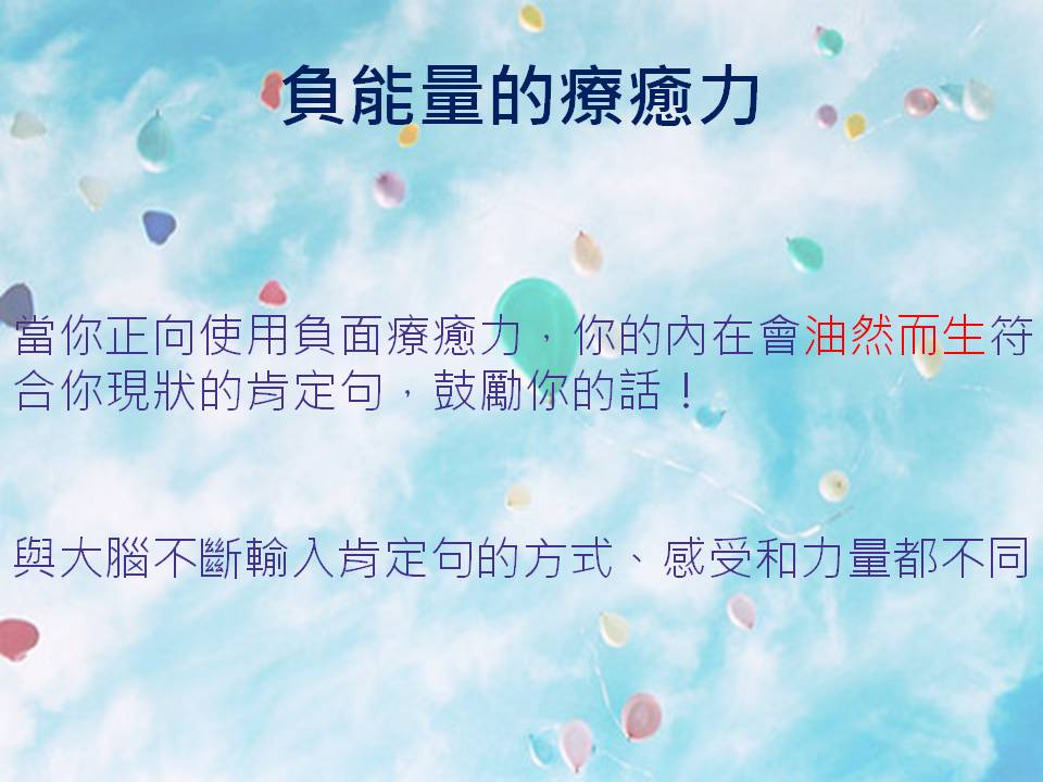 當你正向的使用負面療癒力,你的內在會油然而生符合你現狀的肯定句,鼓勵你的話!那是非常有力量的!與大腦不斷輸入肯定句的方式、感受和力量都不同!