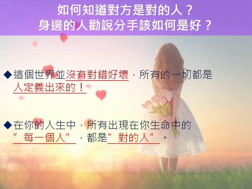 在你的人生中,所有出現在你生命中的”每一個人”,都是”對的人”。