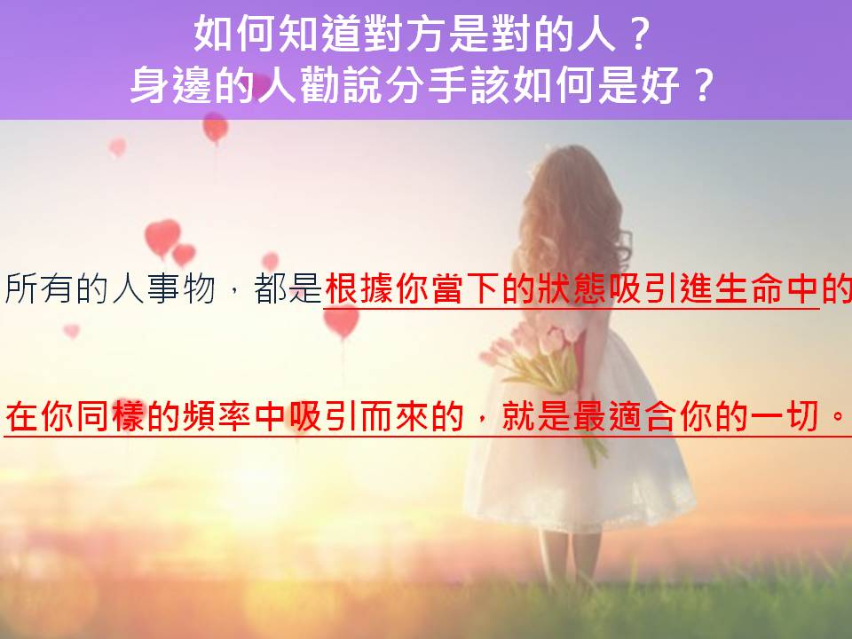 因為所有的人事物,都是根據你當下的狀態所吸引進你生命中的,在你同樣的頻率中吸引而來的,都是在當下最適合你的一切。