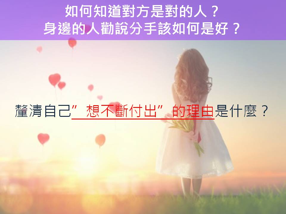 2、我知道也許他不是那麼的好,我很明白,但我一直持續付出我的愛,不想分開的理由是什麼?(ex:也許你喜歡這個被愛的感覺!你想要擁有這個被愛的感覺…)