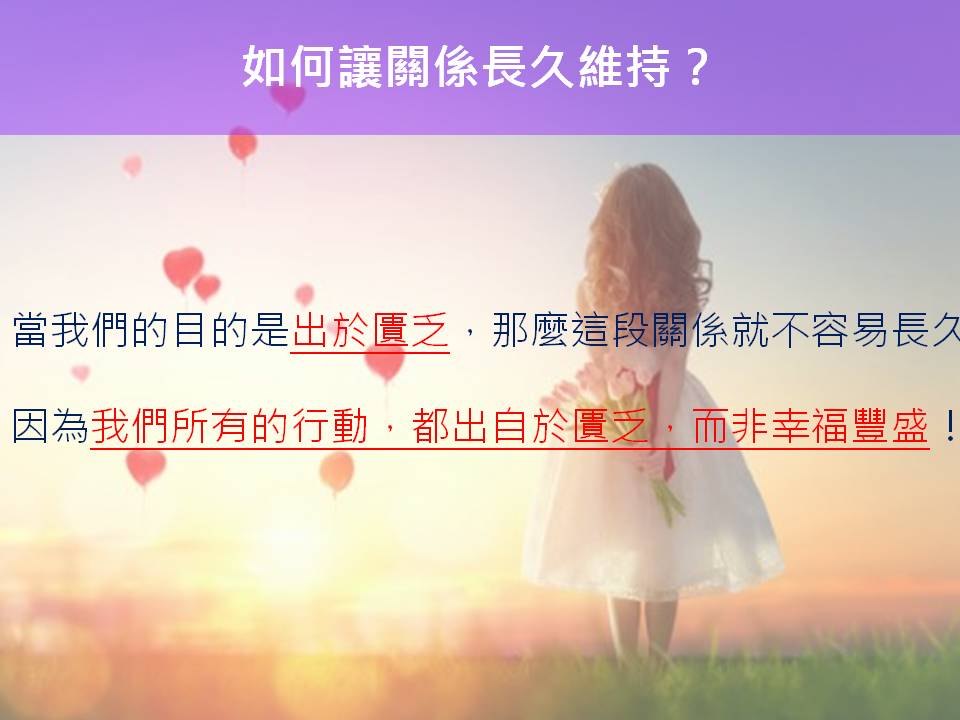 3、當我們愛一個人的目的是出於匱乏,那麼這段關係就不容易長久, 因為我們所有的行動都出自於匱乏,而非幸福豐盛!