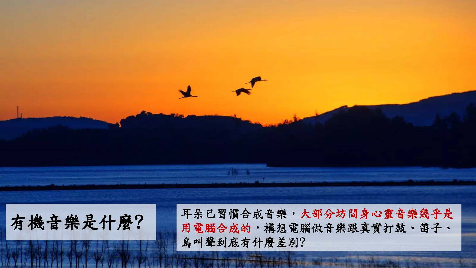 Monica:大家知道有機食物甚至保養品都有有機成分,有機音樂可以想成有機水果盡量不使用農藥、身長激素等等,幾十年來我們耳朵已習慣合成音樂,上網搜尋大部分坊間的身心靈音樂絕大分部都是用電腦合成做出來的,聽起來假假的,我們開始構想電腦做的音樂跟真實的打鼓、笛子、鳥叫聲等到底有什麼不一樣?