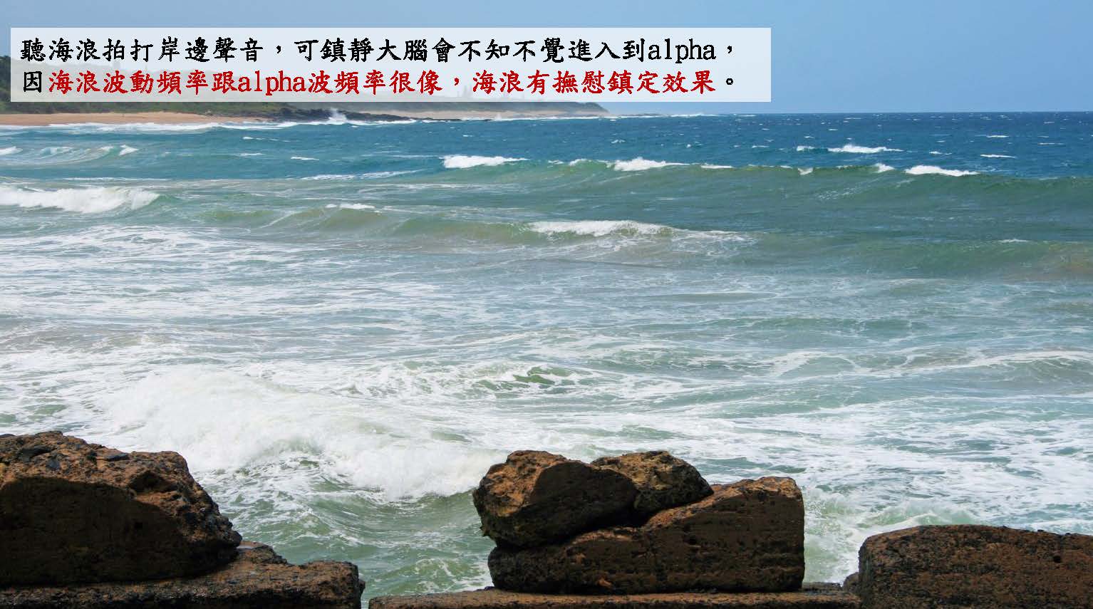4. 聽海浪拍打岸邊聲音可鎮靜大腦會不知不覺進入到A波,因海浪波動頻率跟A波頻率很像,大海海浪有撫慰鎮定效果