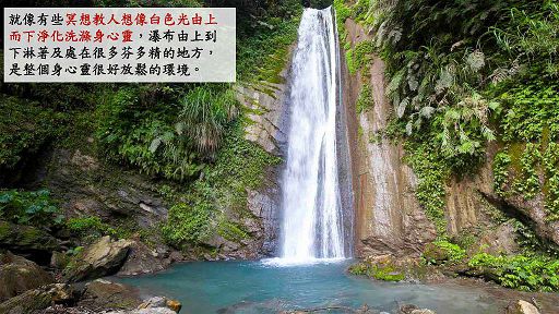 Monica:所有水流聲音都很有淨化效果,好幾年前去大陸上一系列課,有人說山上某個地方有個秘密瀑布,下課後自己走上去站在瀑布下,當瀑布從上到下這樣淋雨,突然想到有些冥想教人想像白色光由上而下淨化洗滌身心靈感覺非常棒,瀑布除了聲音還有白色的光及濺起的水花,在瀑布下一定是在樹林裏頭很多芬多精,整個眼耳鼻舌身及身心靈都是在很好環境裡,建議大家可以在安全範圍內接近瀑布,感覺水珠微微濺到身上感覺,之後做深呼吸是非常療癒的。
