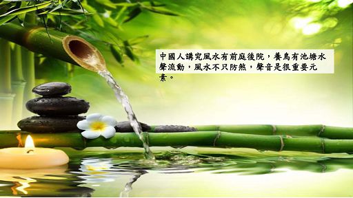 Monica:古代不像現在高樓大廈,中國人講究風水有院子前庭後院會養鳥有池塘水聲流動,風鈴在風水上跟聲音上都是重要的,風水不只防煞聲音是很重要元素,像滴水聲或庭園照景有水流聲或養鳥,古時候人都會配戴玉,玉可以避邪帶來好運外走路時微微會有點聲音,這些聲音都是在創造一些效果,仔細聽研究會發現古時候人除了有雅興外是有研究的。