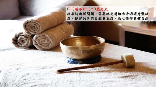 現在人有很大一個狀況,第一個是睡不好除了環境因素還有心理壓力,第二個是壓力大如果可以改善這兩個聲音遠離噪音源讓身體多放鬆,這兩點都做到音樂可以有很大幫助,聽好的音樂自然會放鬆心情好身體自然好。