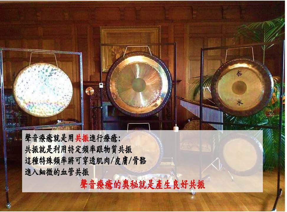 Monica:台灣對於聲音療癒是很陌生的聲音療癒最大原哲是共振,共振跟什麼振?跟好的能量振,好的聲音跟好的聲音激發出好的效果,像德國製銅鑼的工法聲音出來的比較精準要達到多少音頻是固定的,敲擊銅鑼像擴大器一樣有點像大喇叭,音樂開大聲喇叭會跳動傳送到身體銅鑼效果是一樣的,像宇宙創始來自於嗡的振動聲音,共振是跟固體東西共振跟肌肉皮膚骨骼在進入更小的血管共振,身上血液超過體重百分之70以上,聲音療癒奧秘就是產生良好共振,帶到身體每一個角落甚至可以帶到磁場再帶到光環外面能量場中。