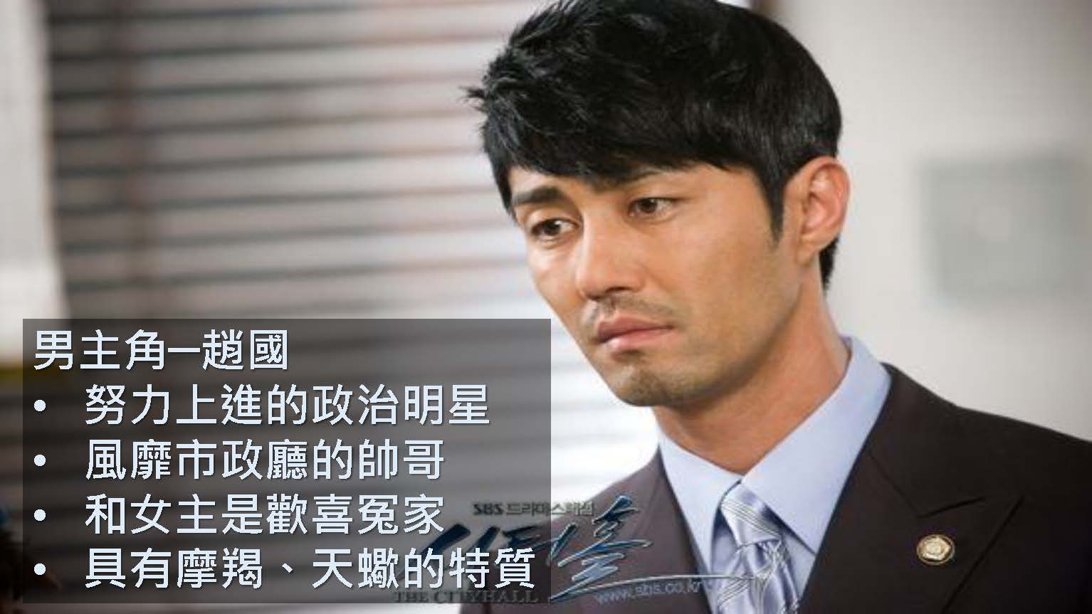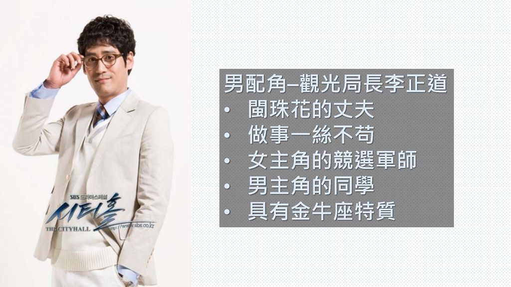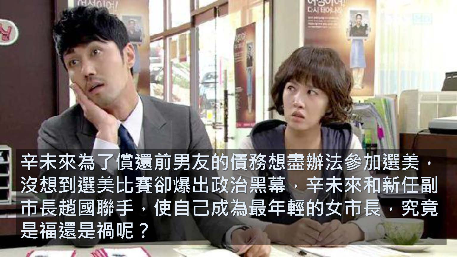 《市政廳》是2009年的韓國火紅連續劇,敘述在仁州市工作待了十年的十級公務員辛未來,想要藉由選美獎金償還前男友帶來的債務,孰知新任副市長–趙國是政黨大老BB派來獲取政治利益,而選美比賽則是現任市長和趙國之間的政治角力,辛未來為了獲得后冠,不惜用盡各種方法提高選美佳麗的年齡限制和條件,沒想到選上後卻一毛都沒有得到,為了拿回該得的獎金、為了支持她的好友們,辛未來站上了選舉車,成為仁州市最年輕的女市長….