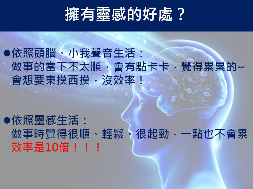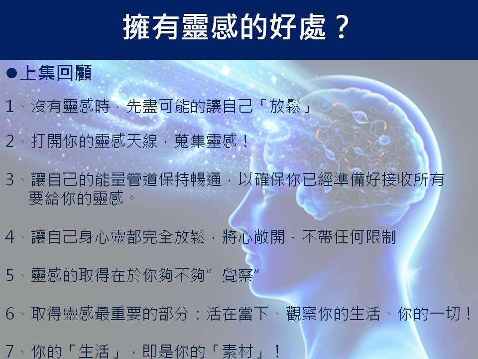 1、擁有靈感,不只在你需要時可以幫助你解決問題,甚至可以在你生命中,無時無刻運作!