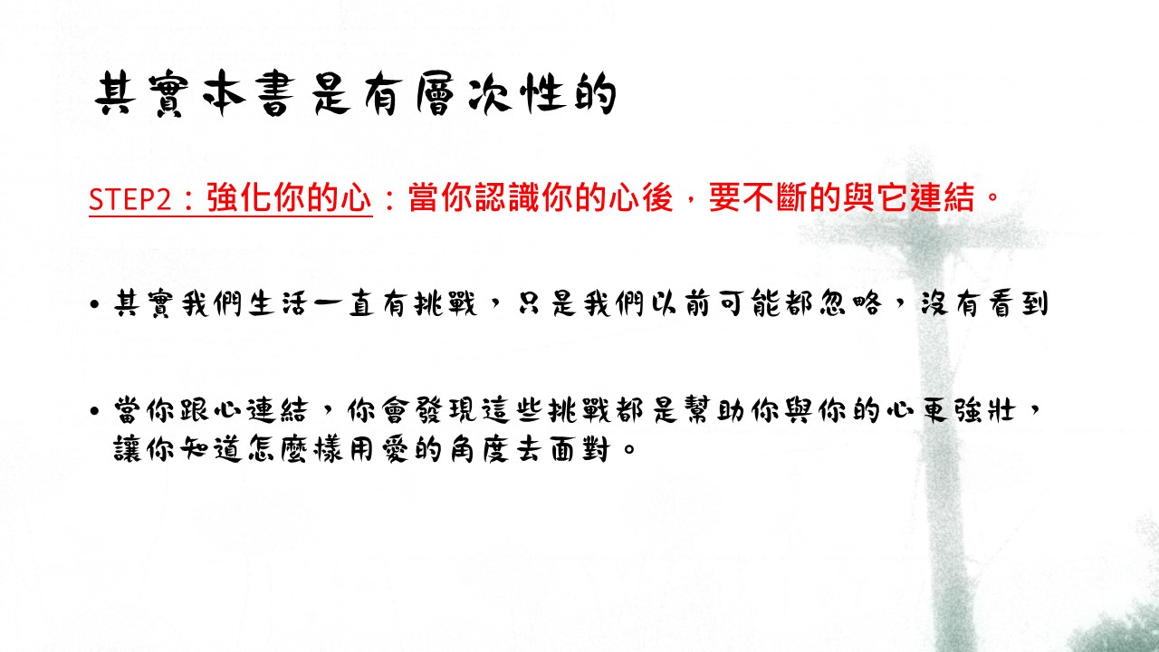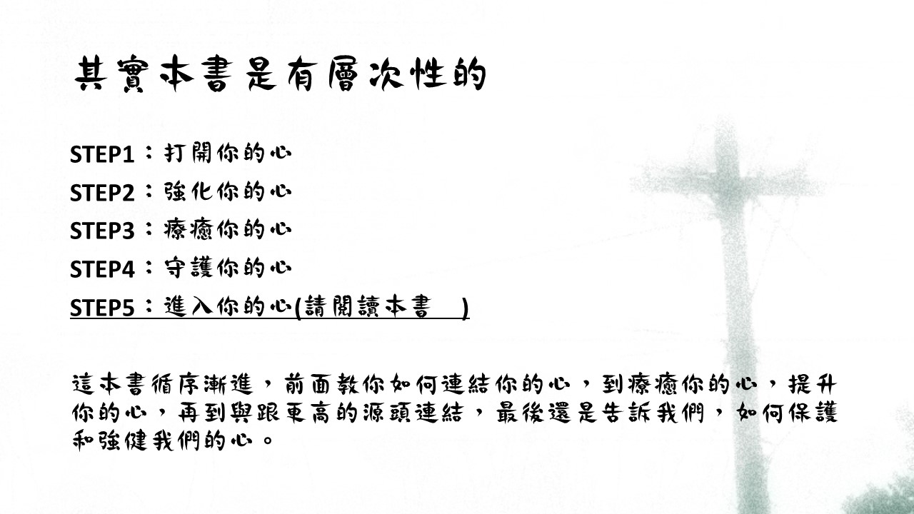 這本書循序漸進,前面教你如何連結你的心,到療癒你的心,提升你的心,再到與跟更高的源頭連結,最後還是告訴我們,如何保護和強健我們的心。