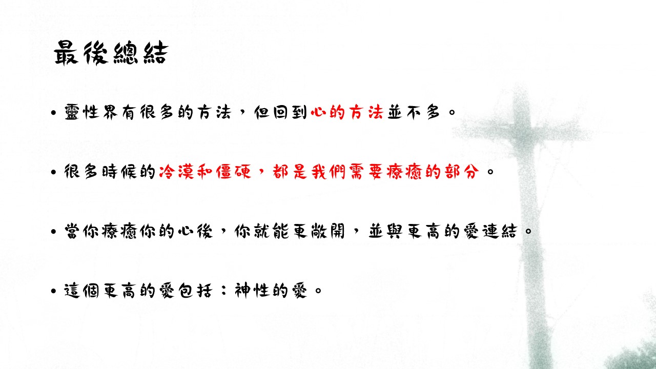 主編:當我們心智軟弱時,不斷的向神祈禱(這裡指的可以是宇宙的造物主,或源頭、內心),向內心源頭不斷的祈禱,請祂給你力量,就能與祂連結上。