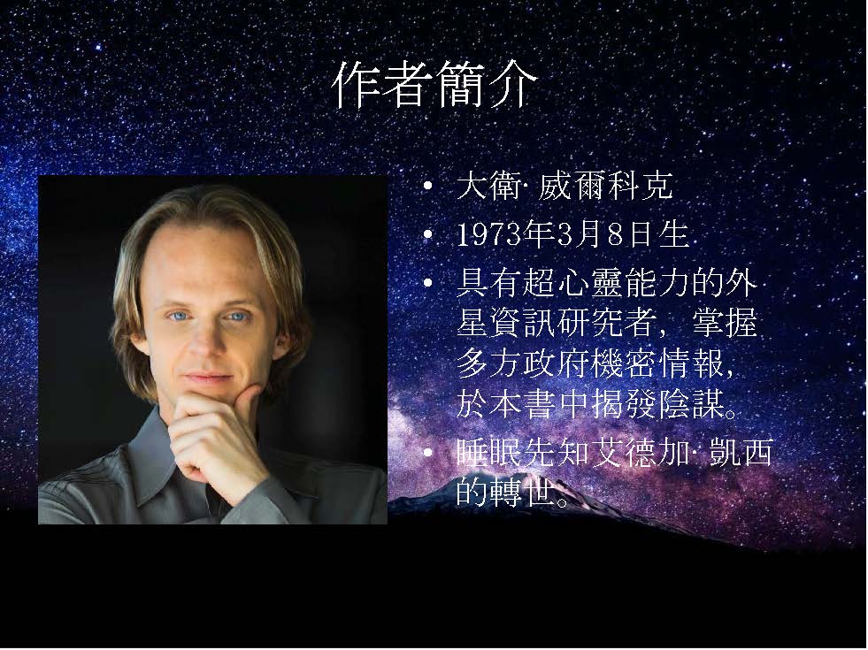 自己曾在部落格分享過作者是個很妙的人,說他前世是催眠先知愛德嘉.凱西,之後拿兩個人星座盤核對,結果度數完全一樣只是行星位子不同,有位星座專家說要跟一個人星盤相同重疊同一個度數要200多年才有一次,所以是很罕見例子,作者深信他是愛德嘉路線,還沒出書前靠通靈維生,接通靈個案很準確都很紅,但作者感興趣還是宇宙及外星人,愛德嘉.凱西會進入催眠狀態幫助人回答問題有基督教路線,但我覺得他是外星人路線。