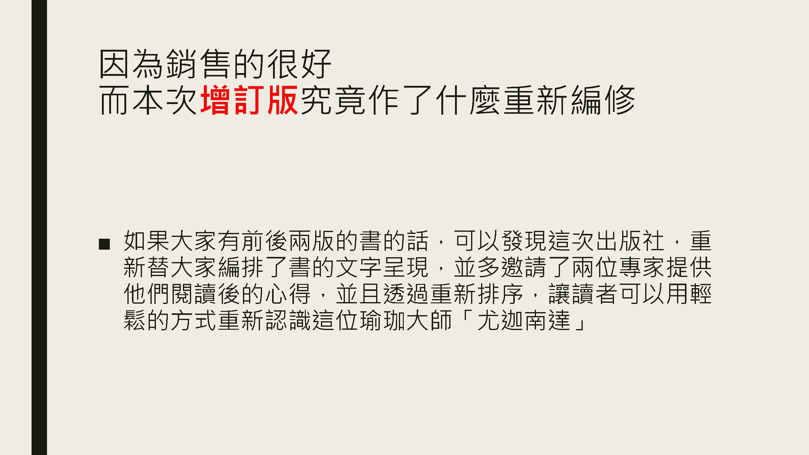 主:如果大家有前後兩版的書的話,可以發現這次出版社,重新替大家編排了書的文字呈現,並多邀請了兩位專家提供他們閱讀後的心得,並且透過重新排序,讓讀者可以用輕鬆的方式重新認識這位瑜珈大師「尤迦南達」