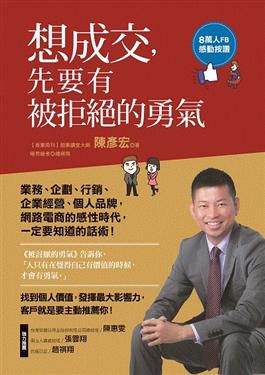 陳彥宏:這本書書名叫『想成交, 先要有被拒絕的勇氣』顧名思義,這本書講想成交,所以這本書是針對業務銷售所需要具備的能力所寫的一本書,那他講的被拒絕的勇氣,事實上這本書在撰寫的過程中,有點搭暢銷書被討厭的勇氣的熱潮,『被討厭的勇氣』書中有講到一段說:「人只有在自己覺得有價值的時候,他才會有勇氣」,換句話說,我們只有在做一件事情覺得自己有價值的時候,我們就會義無反顧,就不會顧慮太多,我們就會堅持去做。我覺得這個精神,用在業務銷售也是一樣,我們在銷售的過程中往往會擔心客戶拒絕他,那事實上他一直沒有去思考的是,客戶拒絕的不是他這個人,他拒絕的也不是他這個商品,他可能只是暫時沒有意願或者發現自己有這個需求,那為什麼那麼怕拒絕,我覺得這個跟我們剛剛提到話:「人只有在自己覺得有價值的時候,他才會有勇氣」這句話做了很好的詮釋,為什麼怕拒絕,因為業務人員可能還沒有看到他的工作室有價值的,或者他的產品是可以提供給客戶他們需要的價值的。