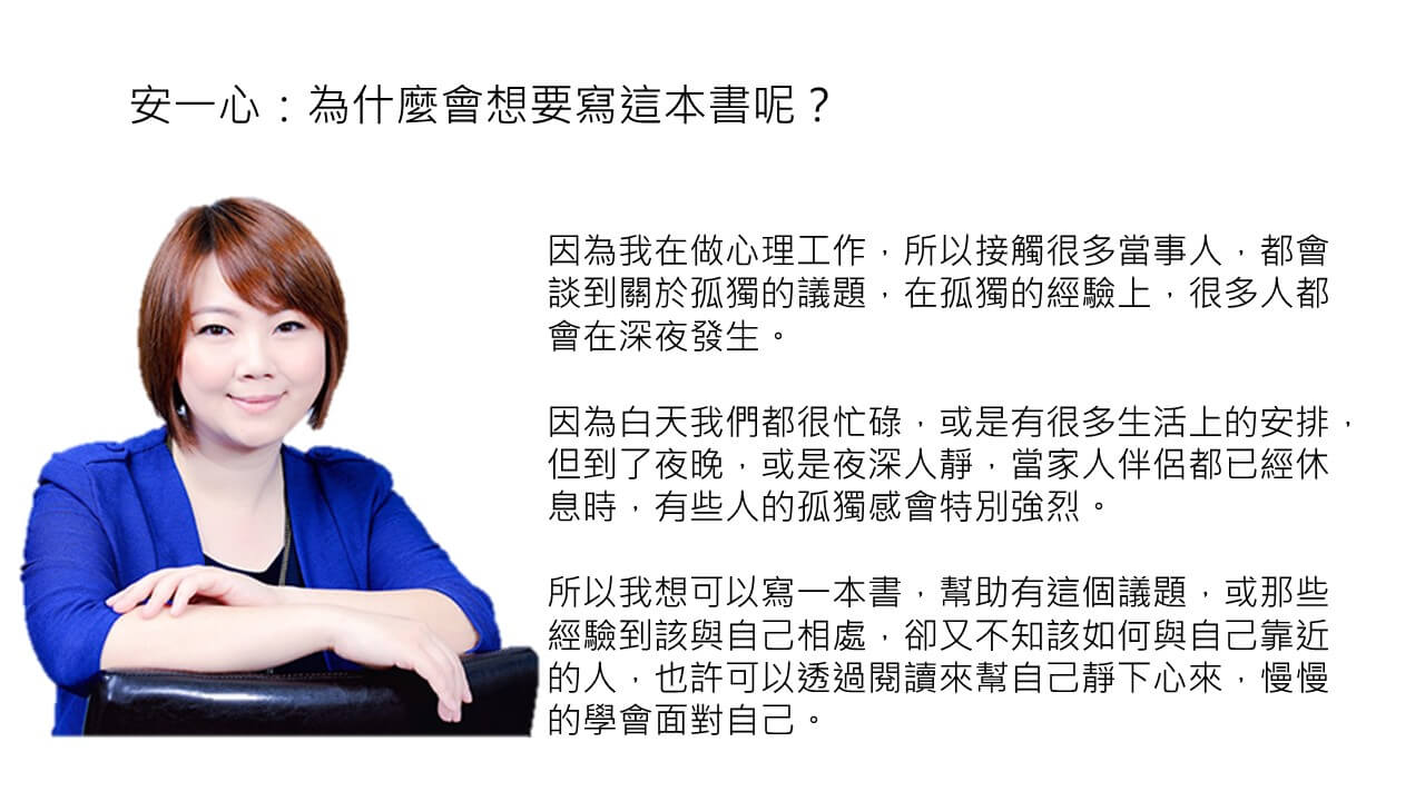 安:我覺得老師這本「入夜擁抱你」,剛開始就要好好的去面對真實的自己,讓自己可以好好療癒自己的心,把自己先好好圓滿,才能讓外在的投射更加美滿。