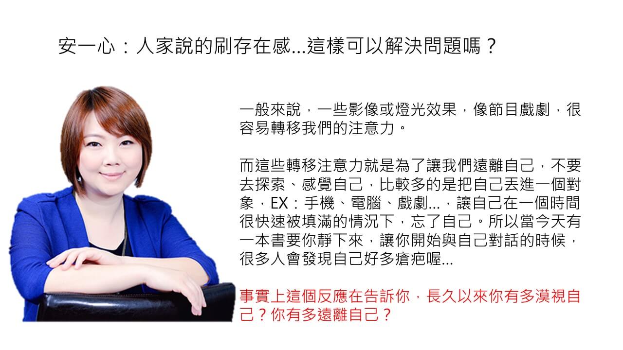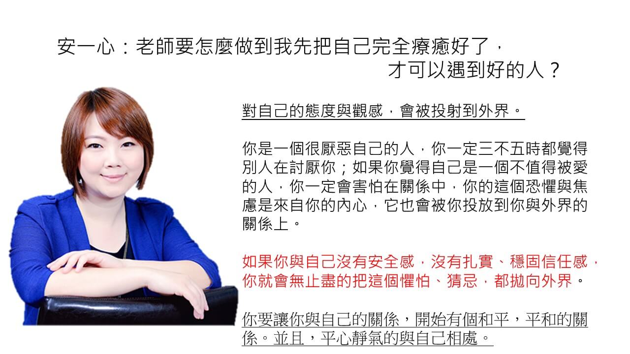 安:很多人看了書後,會知道自己有這些狀況,可是實際上遇到感情上的狀況時,還是會一直鬼打牆,他把我不愛他的那些缺點都顯現出來,我的害怕、孤單…