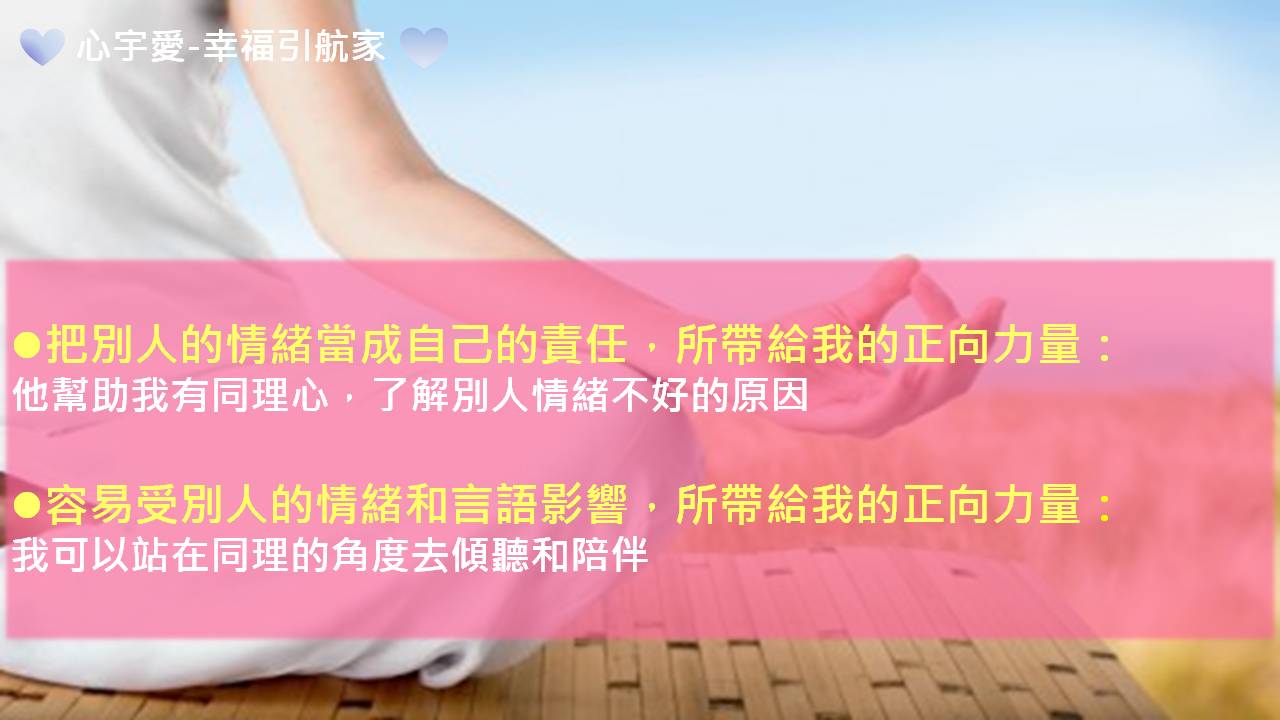 把別人的情緒當成自己的責任這件事上,他帶給我的正向力量是:他幫助我有同理心,了解別人情緒不好的原因,甚至我可以很敏感的感覺到對方是不是情緒不好?不太開心?
