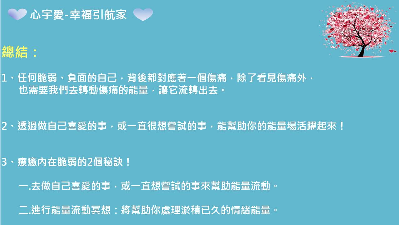1、任何脆弱、負面的自己,背後都對應著一個傷痛,除了看見傷痛外,也需要我們去轉動傷痛的能量,讓它流轉出去。