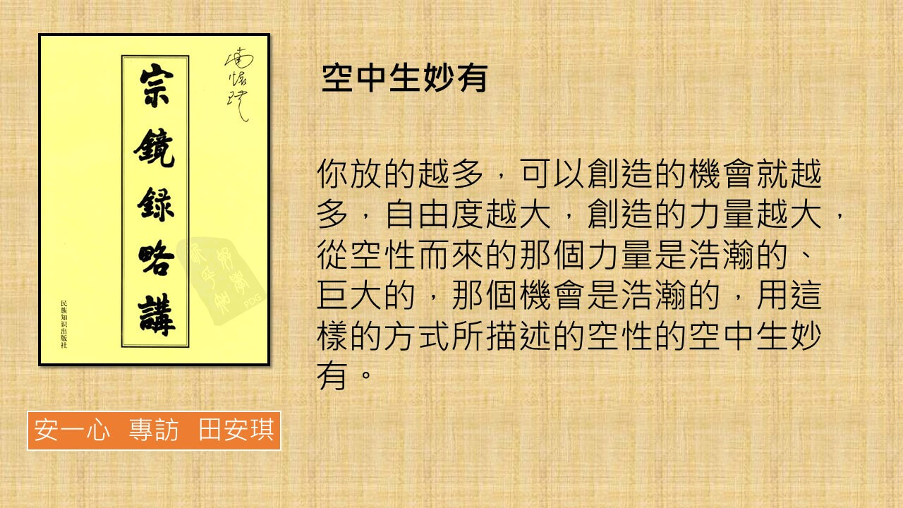 空中生妙有,講的就是,你放的越多,可以創造的機會就越多,自由度越大,創造的力量越大,從空性而來的那個力量是浩瀚的、巨大的,那個機會是浩瀚的,用這樣的方式所描述的空性的空中生妙有。