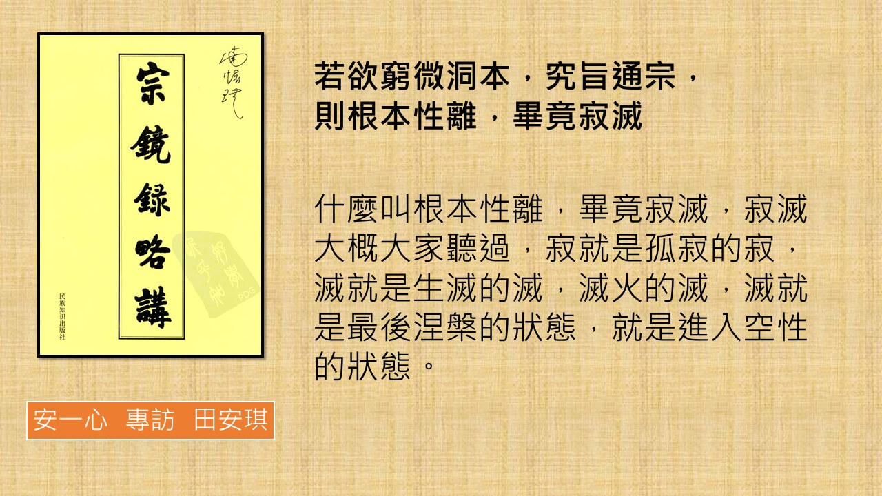 若欲窮微洞本,究旨通宗,則根本性離,畢竟寂滅,前面兩句就不說了,意思是如果你想要探究得更深的話,我要講這八個字,什麼叫根本性離,畢竟寂滅,寂滅大概大家聽過,寂就是孤寂的寂,滅就是生滅的滅,滅火的滅,滅就是最後涅槃的狀態,就是進入空性的狀態。