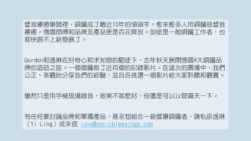 有任何要討論品牌和單獨產品,甚至想組合一組聲療銅鑼者,請私訊逸琳(Yi Ling)或來信 love@sonicblessings.com