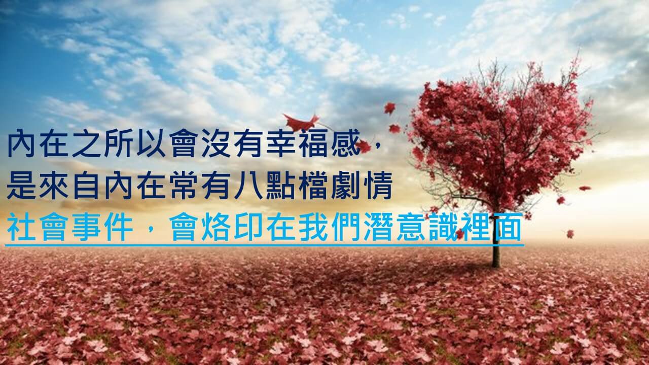 內在之所以會沒有幸福感,是因為來自我們內在,常有這種八點檔,我的愛就是要這種吵吵鬧鬧,我的幸福、我的生活就必須要有這些爭奪,你知道嗎?這些社會事件,跟這些事情,都會烙印在我們的潛意識裡面。