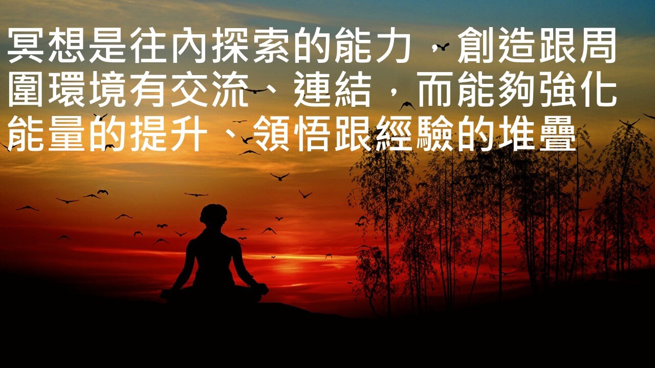 4.冥想是往內探索的能力,創造跟周圍環境交流、連結,而去強化能量的提升領悟跟經驗的堆疊。