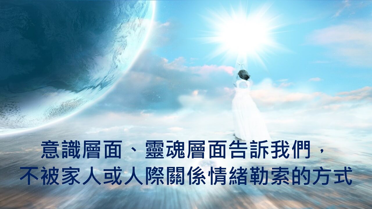 跟我們常提的振動頻率有關,常讓自己在一個正面的振動頻率之下,沒有任何人可以對我們情緒勒索,因為意識創造我們的實相,今天我們會讓自己在很多情緒勒索的狀態,勢必是因為我們的意識建構裡面,沒有這一條「不被勒索是正常的事情」。