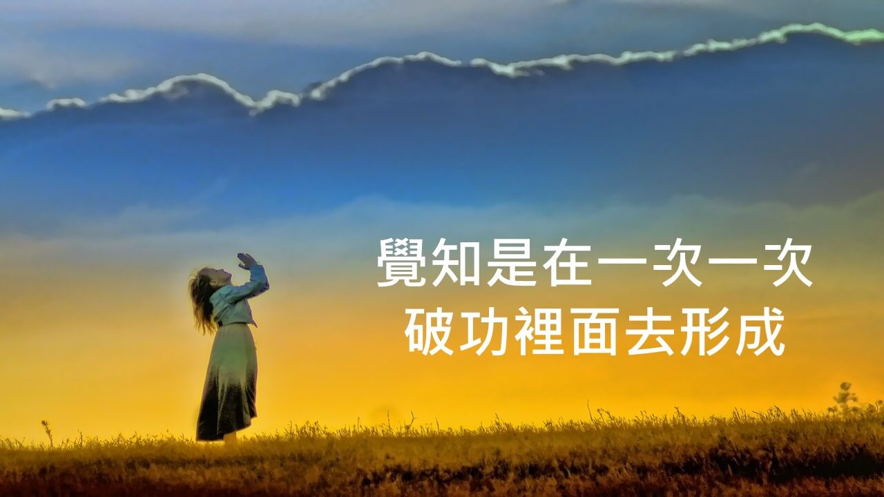 覺知就是在一次一次的破功裡面去形成的,而不是念肯定句、說肯定句,做很多身心靈的儀式、工作,一到關係裡面完全就不行了,一不行就退回來自己的空間,與世隔絕,這不是正面的讓自己帶著覺知的方式,也不是鼓勵大家要讓自己一直在關係裡面衝撞,不是!是自然心、平常心。
