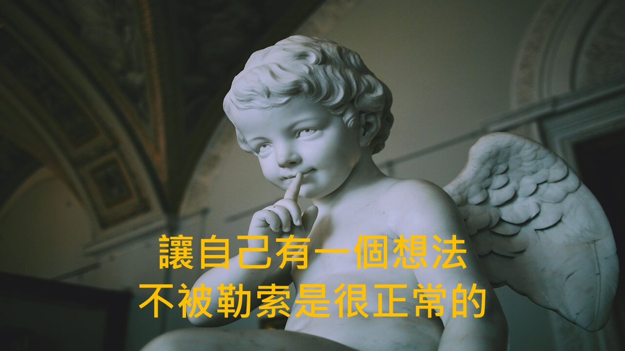 安老師的書裡,一開始有提到,我們要讓自己有一個想法,就是不被勒索是很正常的事,要有這個概念,不被勒索,沒有這個概念的話,我們很難從不被勒索或被勒索,這個分析,二元對立裡面跳脫,如果今天真的有覺知了,被勒索、不被勒索,跟我們沒有關係,我們就沒有在這個劇本裡面了。