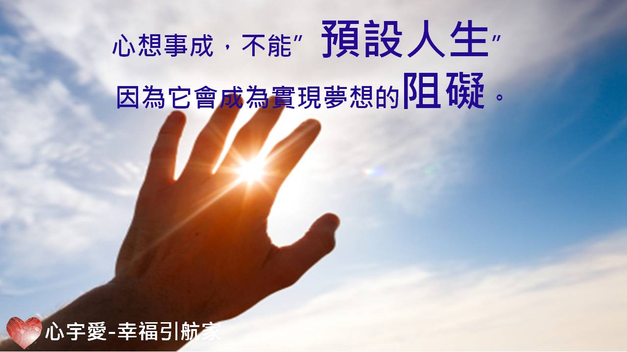 2.如果你真的想要心想事成,實現願望,你就不能”預設人生”,因為這些預設,都將成為實現夢想的阻礙。