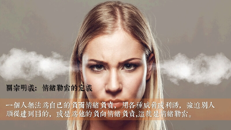指的就是,當一個人無法為他自己的負面情緒負責,會想要用各種威脅的,或是利誘的方式,而強迫別人,來順從他所想要達到的目的,或是來為他的負向情緒,做負責的行為,等於是對「對方」進行情緒性的綁架。