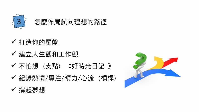 第一個-打造你的羅盤,知道人生的方向,就是你的支點,你的人生為何而在?為誰而在?很清楚自己的人生觀,人生最在意的價值觀是什麼