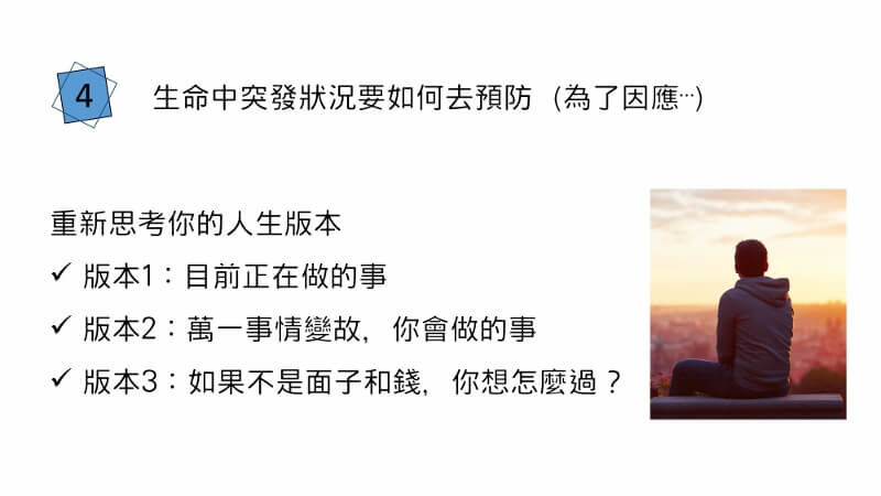 第二個 萬一有變故的時候,你會做的事情,就是這件事情,你如果突然因為怎麼樣了,比如說:我有一個朋友他是獨子,他的爸媽重病,就必須要辭掉朝九晚五的工作,變成相對彈性的自由工作者,你很難去確定你會一帆風順,如你預期的,可能會有變故。