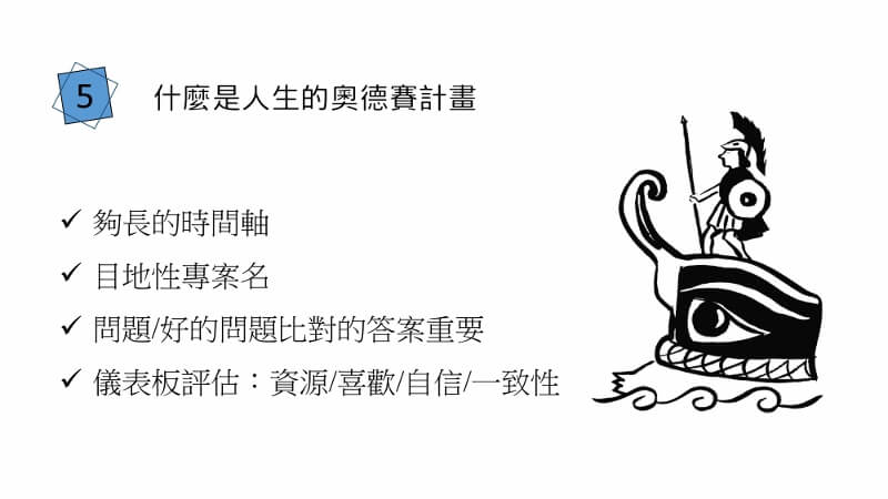 當你想好這三個劇本,就可以列出奧德賽計畫,要用一個時間軸去想,可能三到五年,你會往哪裡走,要給自己一個很漂亮的人生劇本 ,在去針對計畫裡面問一些好的問題,Bill Burnett講過一個好的問題比對的答案更重要,就是說在你的人生裡面你要去找到幾個好的問題來不斷的問你自己,因為你有好的問題就會找到很多不一樣或更厲害的答案,他就提到,你要設定每一個劇本,至少要三個問題,持續的問自己,我還能夠怎麼做,這是最後一個問題。