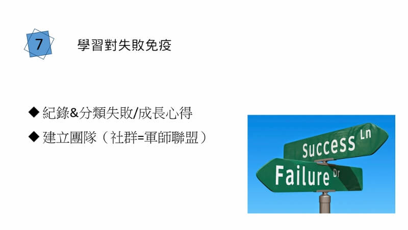七.對失敗免疫:紀錄&分類失敗/成長心得,建立團隊(社群=軍師聯盟)