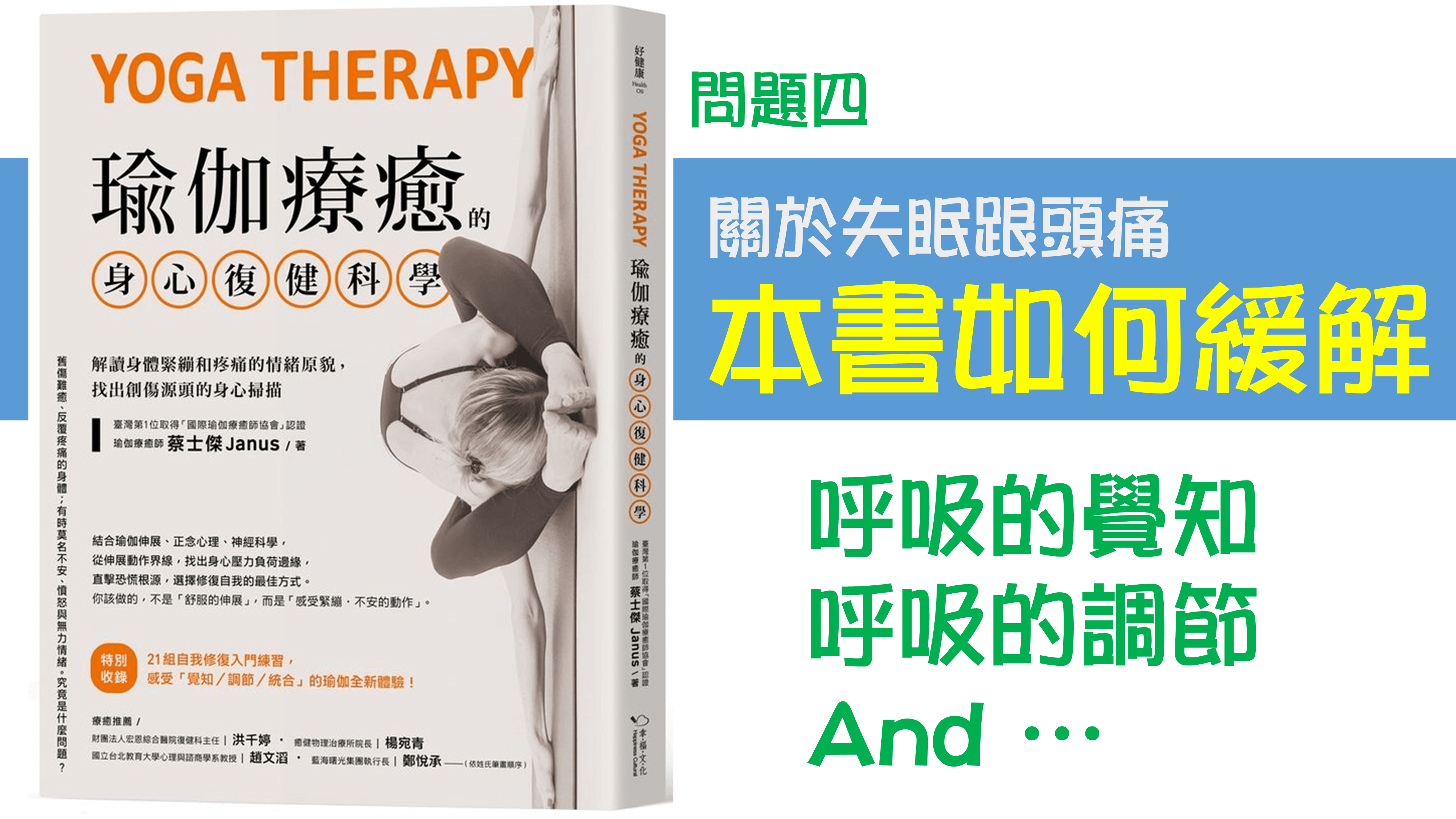 像呼吸的調節、呼吸的覺察,或者一些我們書中還有提到的148頁,左右鼻孔交換呼吸法,都可以很有效的讓神經系統舒緩下來,改善失眠或是頭痛的問題。