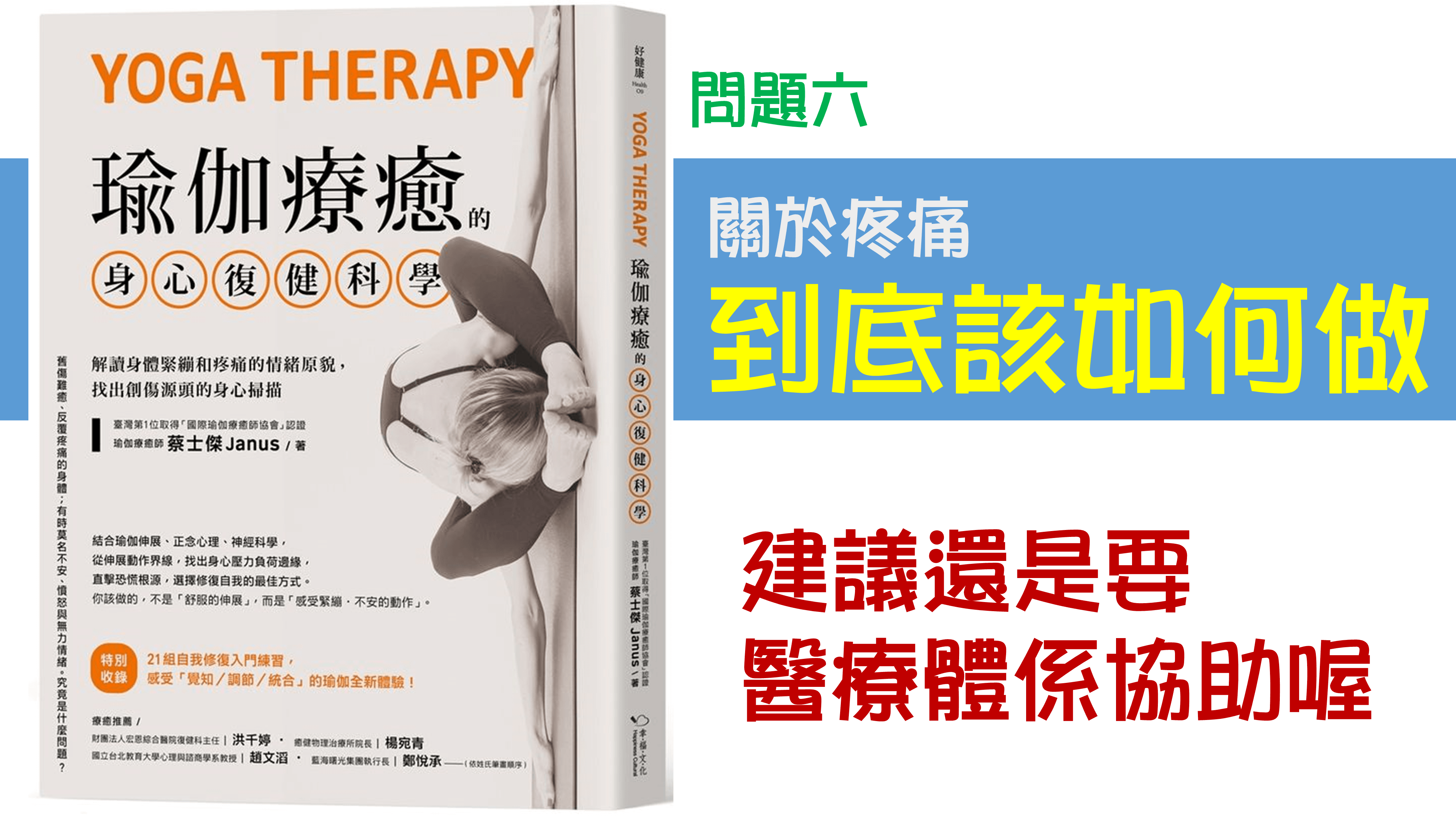 當時想要出這本書是因為在台灣關於瑜伽療癒算是比較新興的科學,並沒有那麼普及,因為我本身的興趣,在前幾年陸續到加拿大跟日本學習關於瑜伽療癒的這個部分,也學習到了從瑜伽來幫助慢性疼痛的照護。