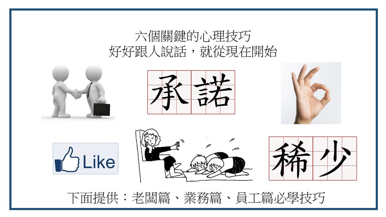 甚至你的小孩,他可能要認同你要他吃更多的青菜,或者早一點睡覺,都可以去想這些人類背後心理上面的需求,這六個方法真的就能夠讓你有