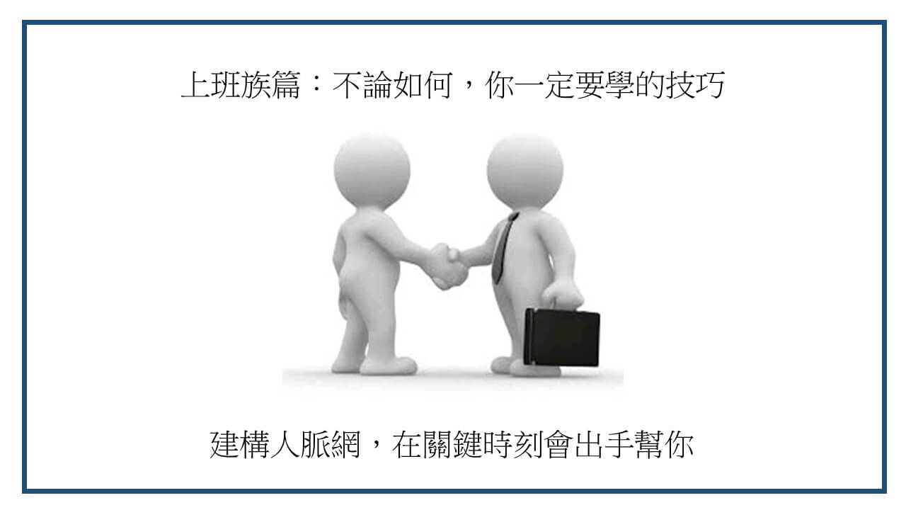 今天即使你只是一個上班族,你應該就要建立聯絡網,抱持著互惠原則,讓你能夠有一群未來能夠在關鍵時刻,幫你打通關鍵的人脈,