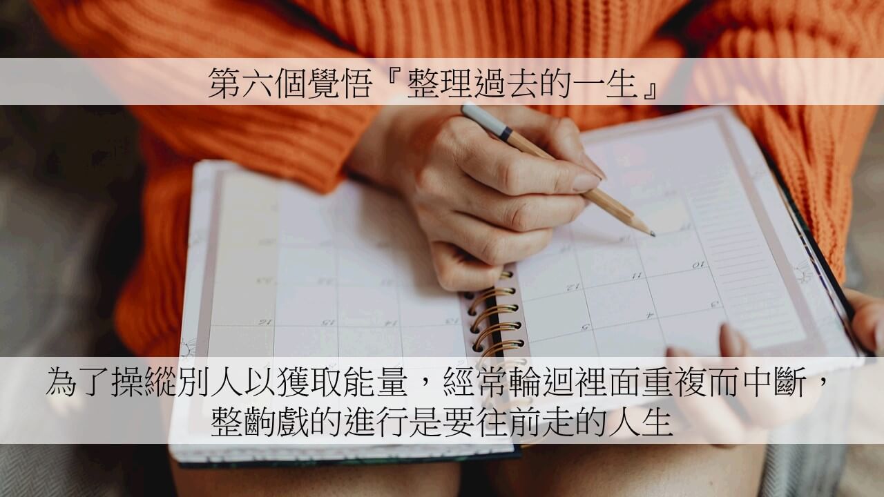 但是,我們目前先簡單談談,第六個覺悟,整理過去一生,然後設法從這個整理之中獲取能量,這是來自我們自己生命之中的能量唷!